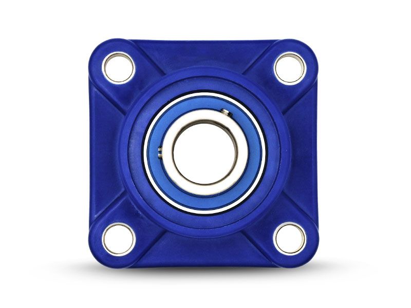 Die 4-Loch Gehäuseeinheit besteht aus einem abgedichteten Kugellager aus Edelstahl (Hochwertiger Werkstoff: 1.4125), lebensdauergeschmiert mit lebensmittelkonformer Fettfüllung NSF H-1 Freigabe, sowie einem Gehäuse aus thermoplastischem Kunststoff (PBT).