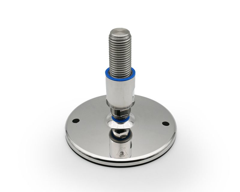 Maschinenfuß / Gelenkfuß TEKNO-HYGIENIC 3-A, Ø 200 mm Edelstahl, M36 x 140 mm, Bohrungen, NBR
