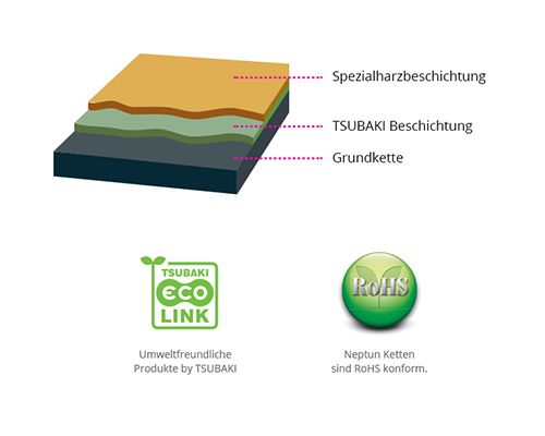 Rollenkette 16 B-2, 1" x 11/16", NEPTUNE korrosionsbeständig, Duplex-Ausführung, DIN 8187, Teilung 25,4 mm, Innere Weite 17,02 mm, Rollen-Ø 15,88 mm, TSUBAKI, *erfüllt RoHS Richtlinien*, Bund zu 5 M. inkl. Vbgl.